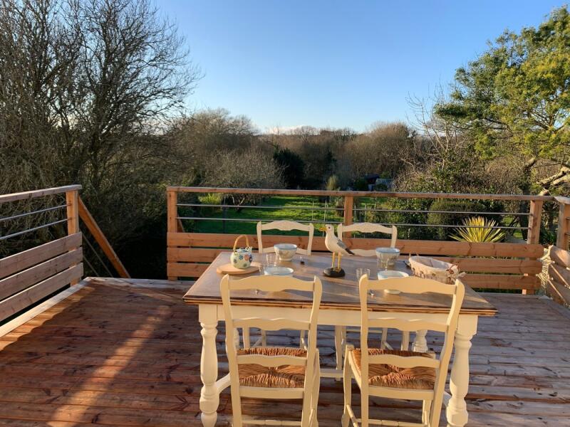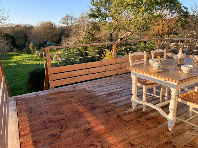Elle dispose d'une terrasse bois donnant sur un jardin arboré.