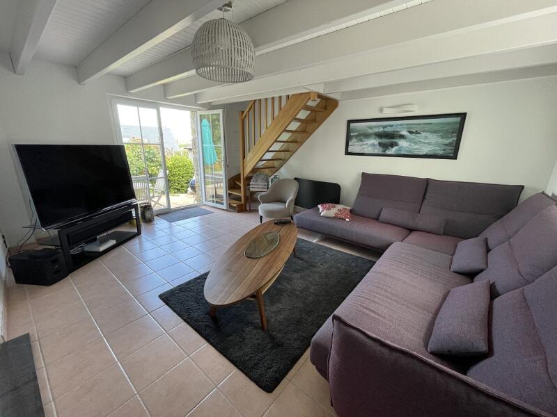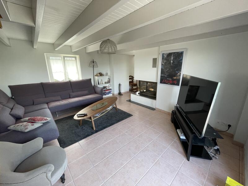 -d' un salon avec baie vitrée donnant sur le jardin et terrasse.